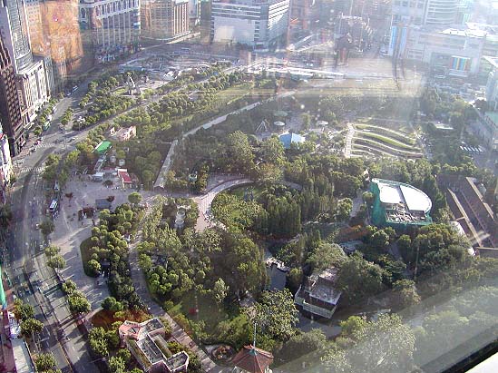 Before taking off on the day's sightseeing, a few photos of Shanghai (213-218) were taken from the Marriott's 38th floor restaurant. In all directions, in this city of 17 million people, there were skyscrapers as far as the eye could see. Immediately below the hotel was the People's Park (216).