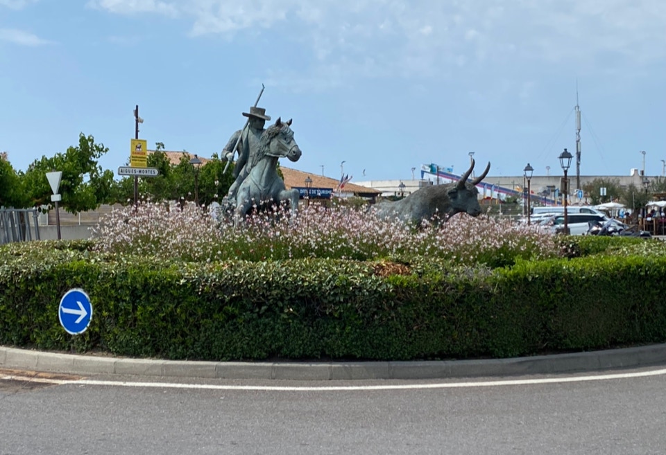 Statue of a Camargue cowboy and a Camarguais, the local bull species. A bull run race is held in the summer.