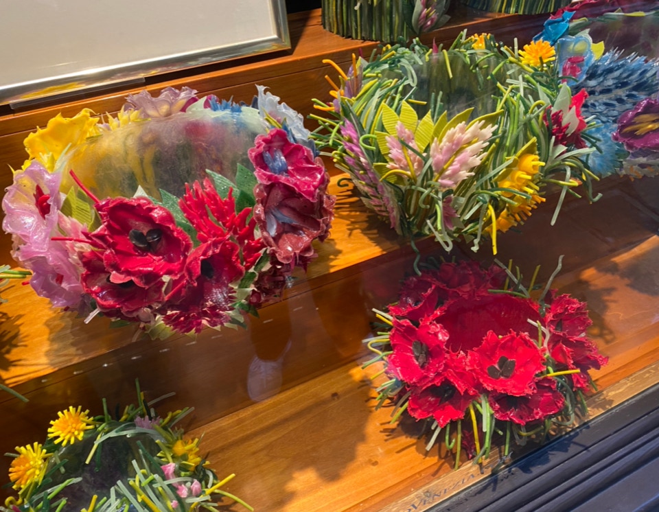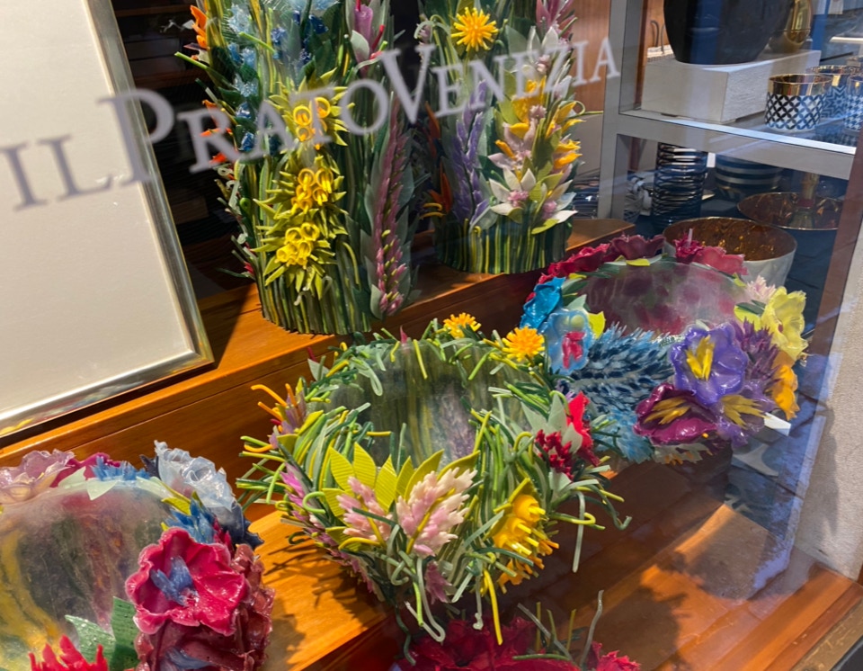 Artificial flowers in a shop window near the hotel-it’s hard to tell what they are made out of but probably portions are glass.