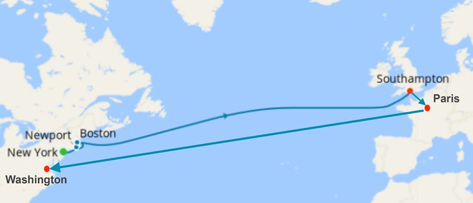 11. Sunday, October 13-Disembark in Southampton, England (arriving early AM)-Cunard bus transfer from Southampton to London St Pancras Int'l Train Station (about 2 hrs for transfer); take Eurostar Train 9032 leaving St Pancras Station to Paris Gare du Nord Train Station (305 miles-2 hrs, 27 minutes). Taxi to Hôtel Fougère.