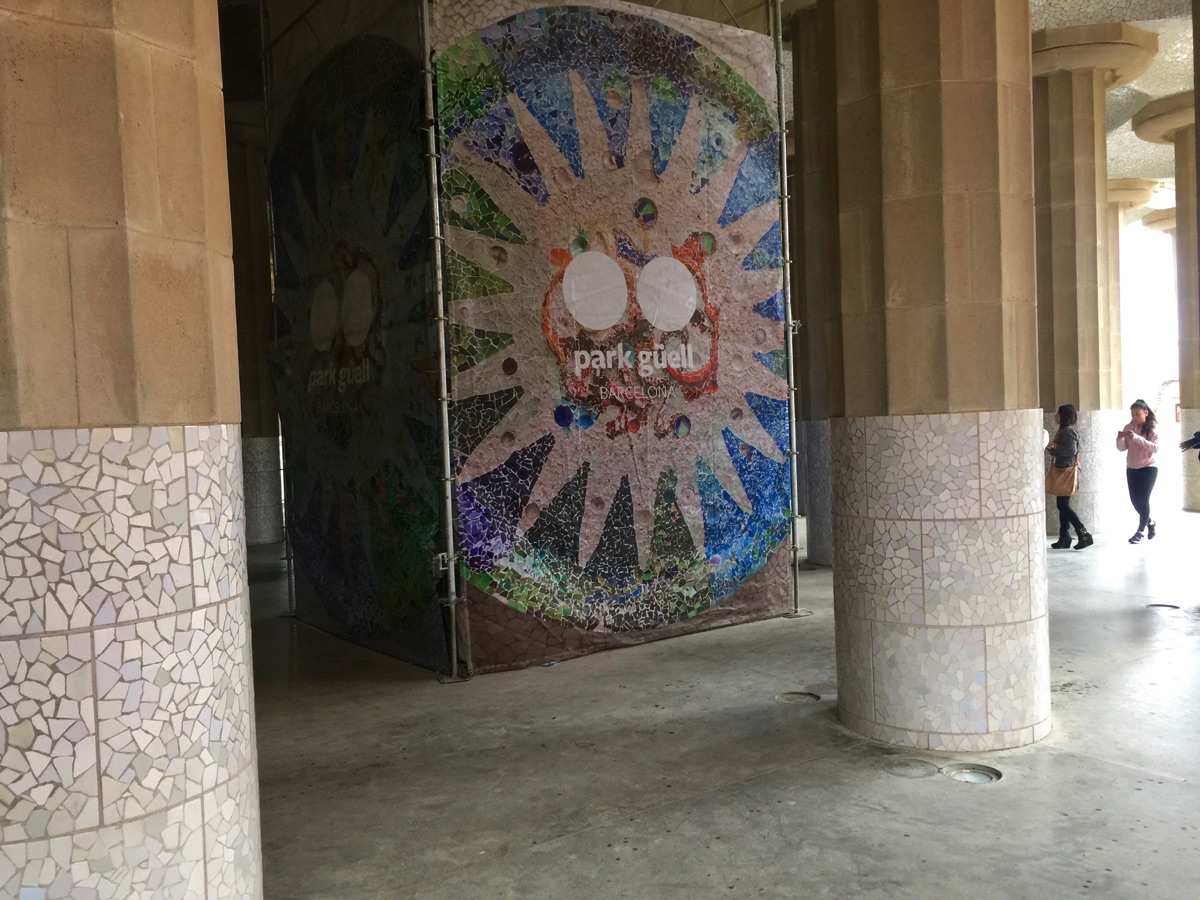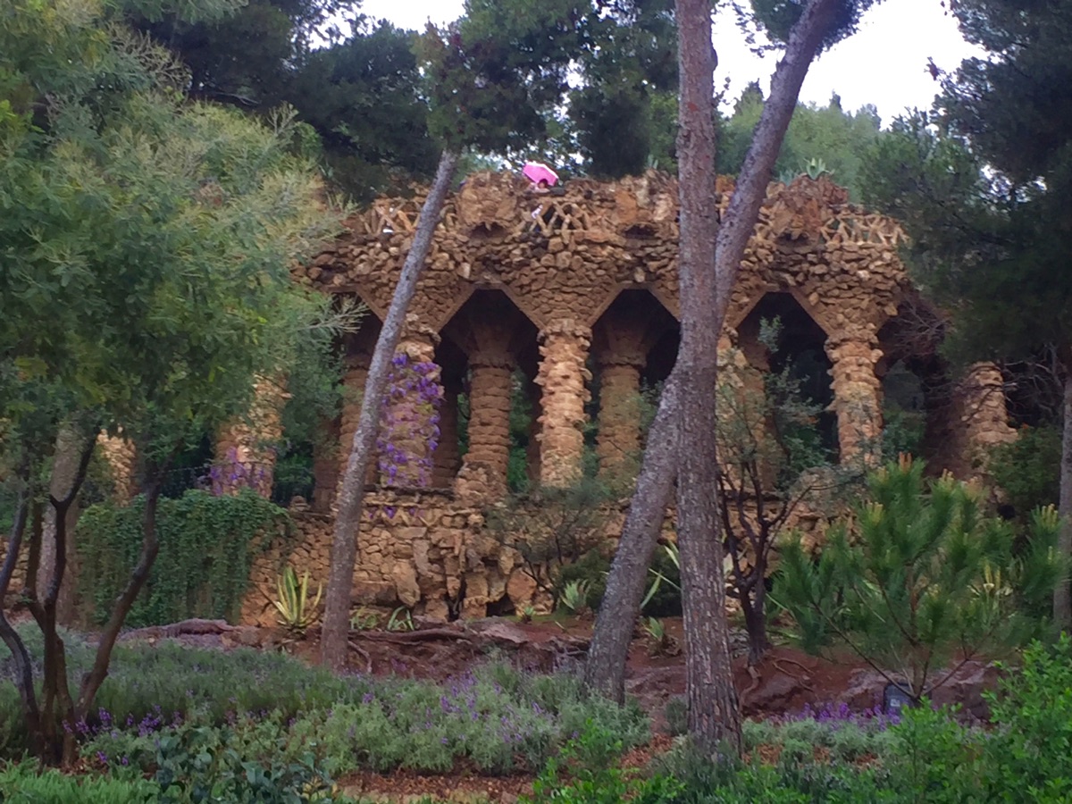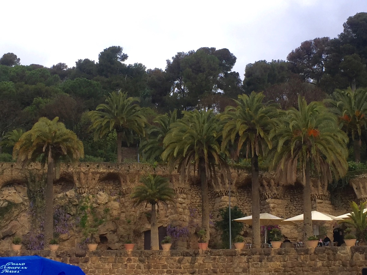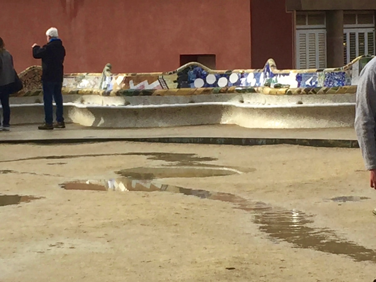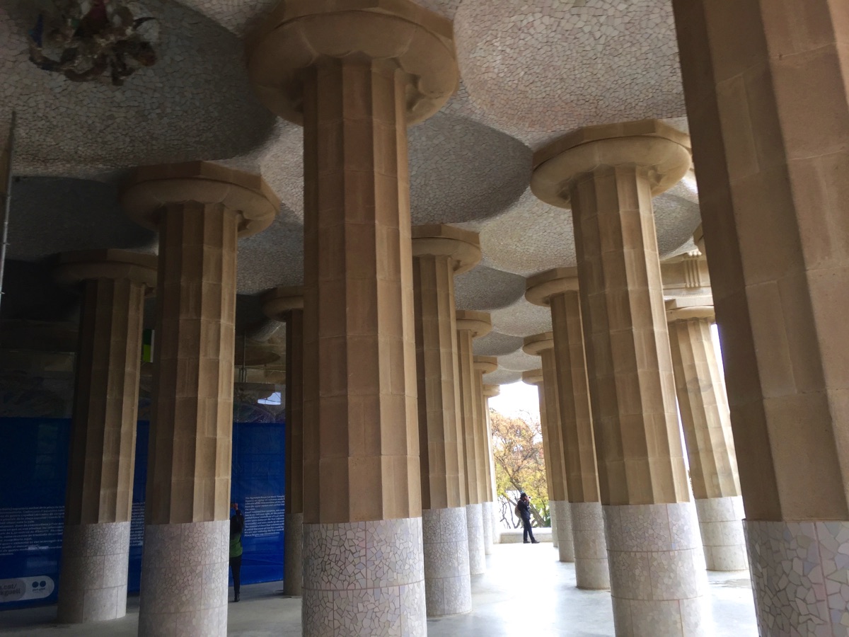 The rain returned but we plunged onwards visiting first Park Güell, named after entrepreneur, Eusebi Güell, who hired Antoni Gaudí, to design the park. In this photo, the columns look like tree trunks but are actually concrete to support a path above.