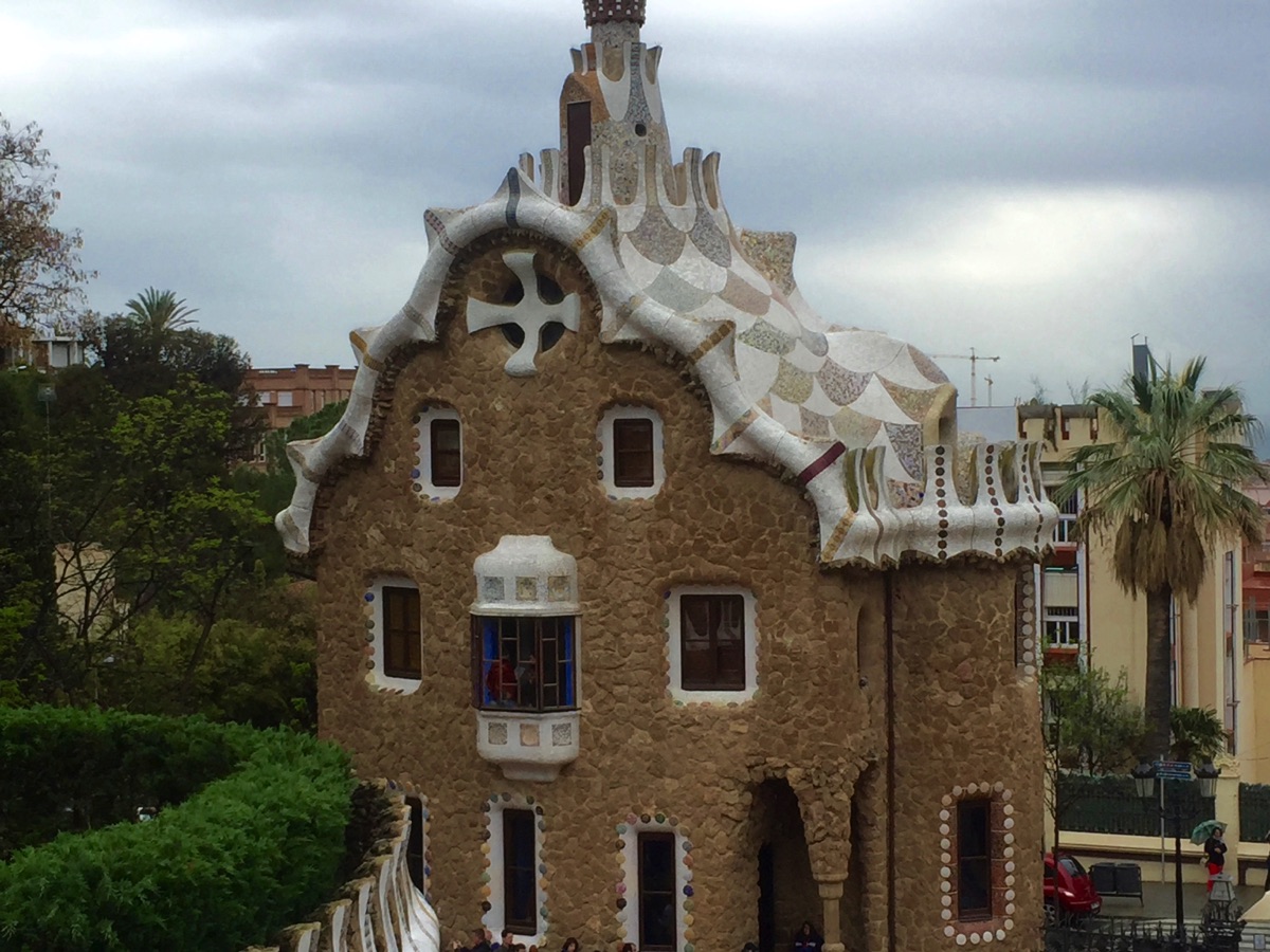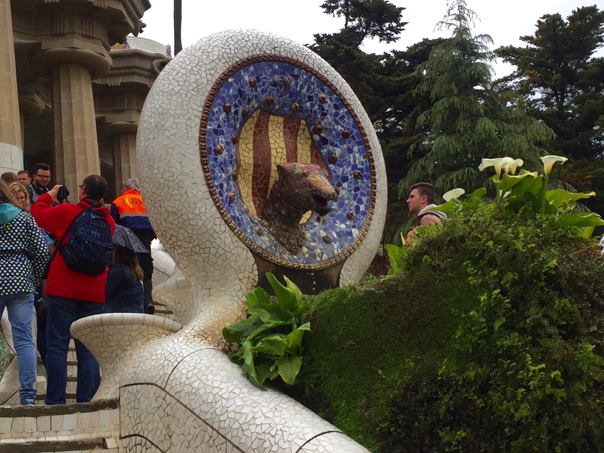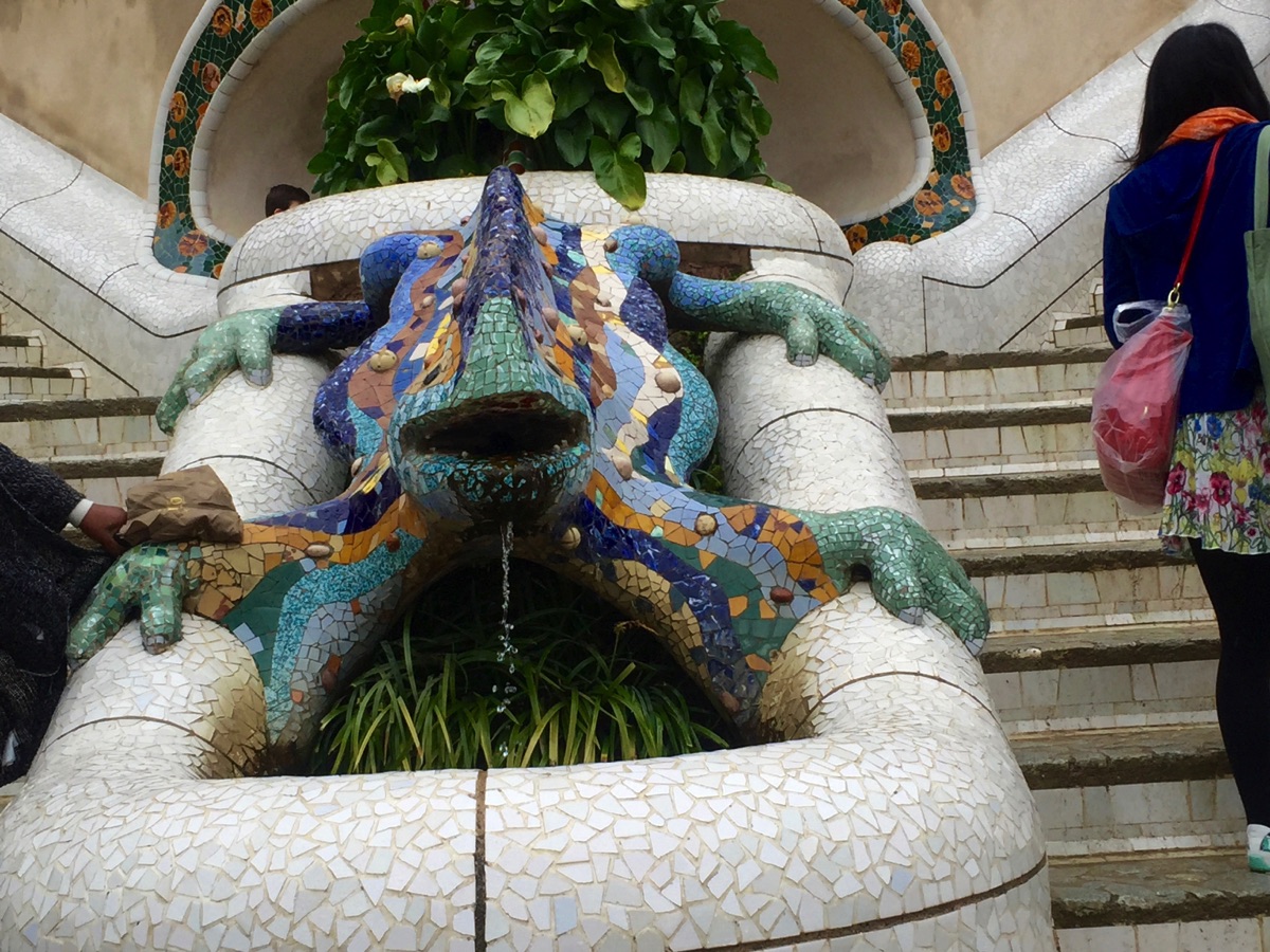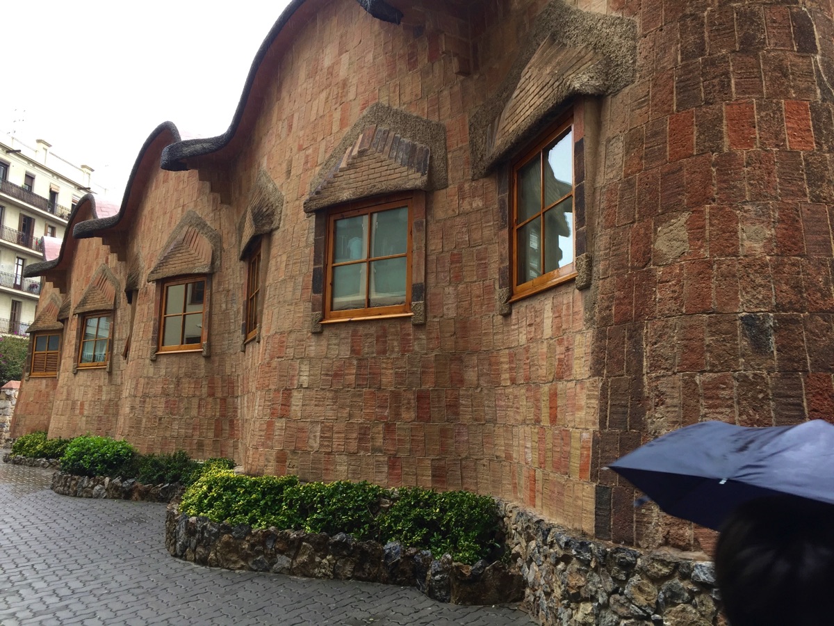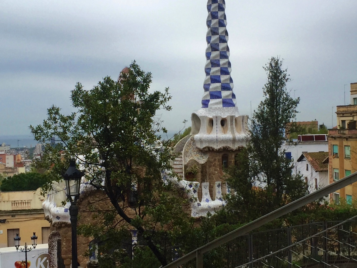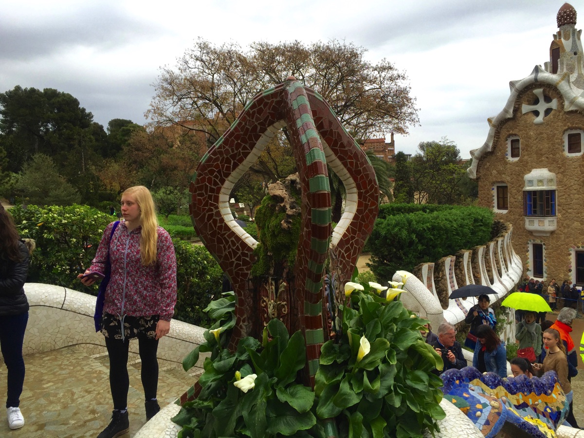 The rain returned but we plunged onwards visiting first Park Güell, named after entrepreneur, Eusebi Güell, who hired Antoni Gaudí, to design the park. In this photo, the columns look like tree trunks but are actually concrete to support a path above.
