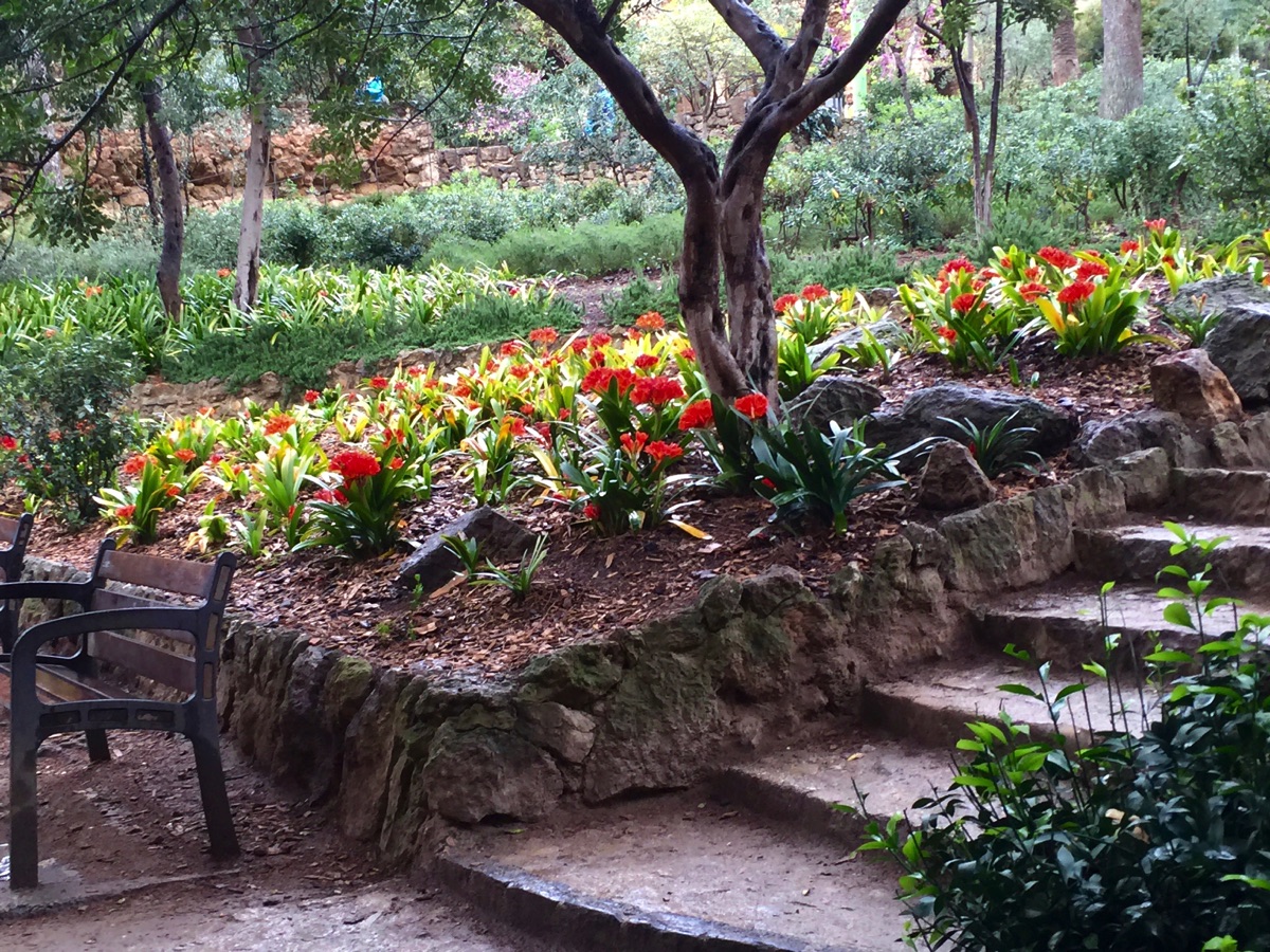 Interspersed among all the green tropical foliage were some beautiful flowers. Park Güell was originally intended to be a suburban housing development but that was unsuccessful and it was eventually turned into its present magical park open to the public.