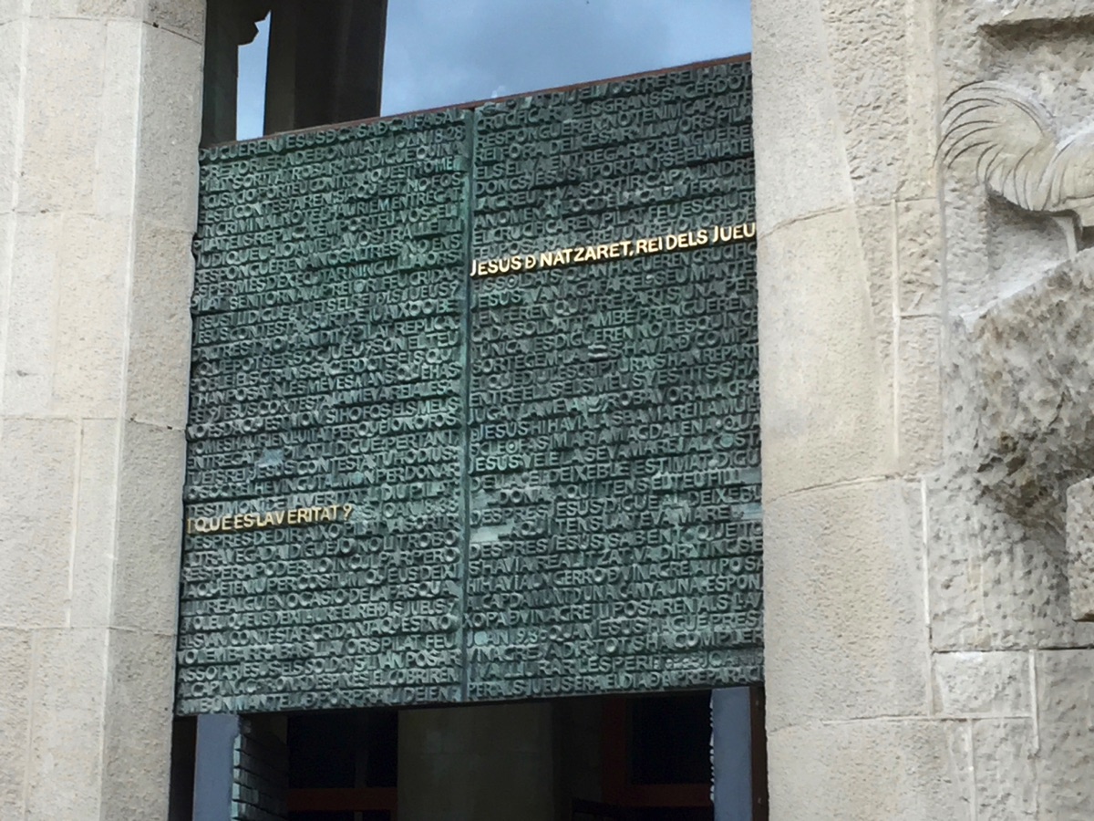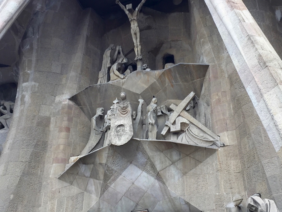 Detail of the crucifixion on the Passion facade. This facade is starkly modern compared to the Nativity facade, reflecting both its later design in a more modern time and the events depicted.