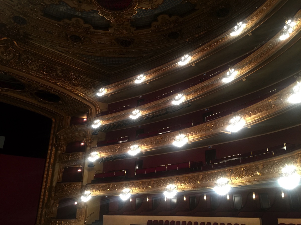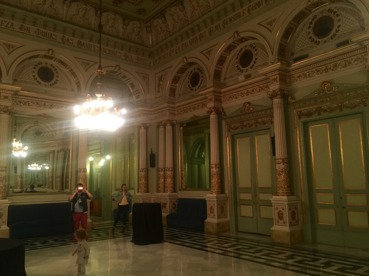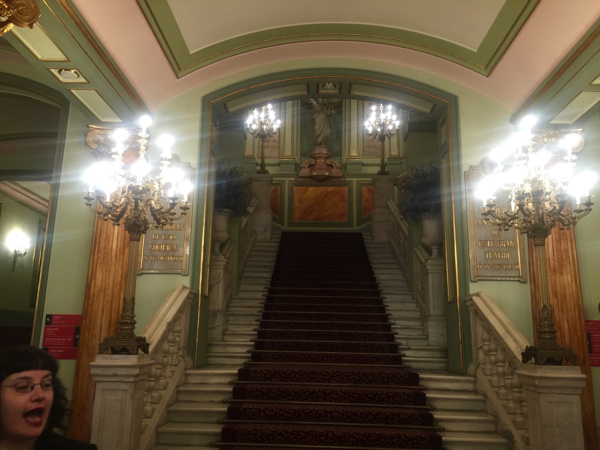 The Opera House in the Gran Teatre del Liceu dates from 1847. This is the main stairway. The building had a severe fire in 1861 but reopened the following year. It also was the scene of a bombing in 1893 in which twenty persons died.