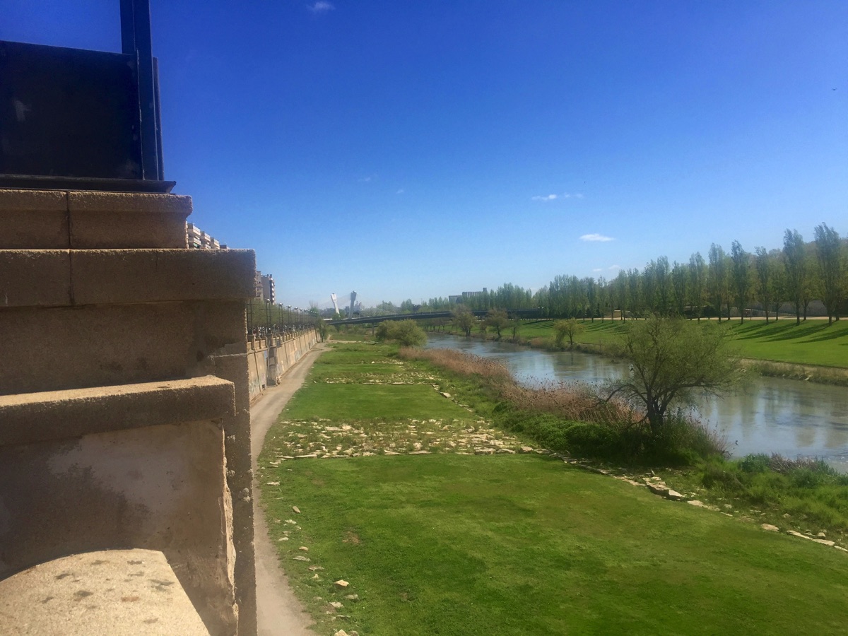 View along the River Segre in Lleida. The Prince of Viana Bridge, opened in 2010, is in the background.