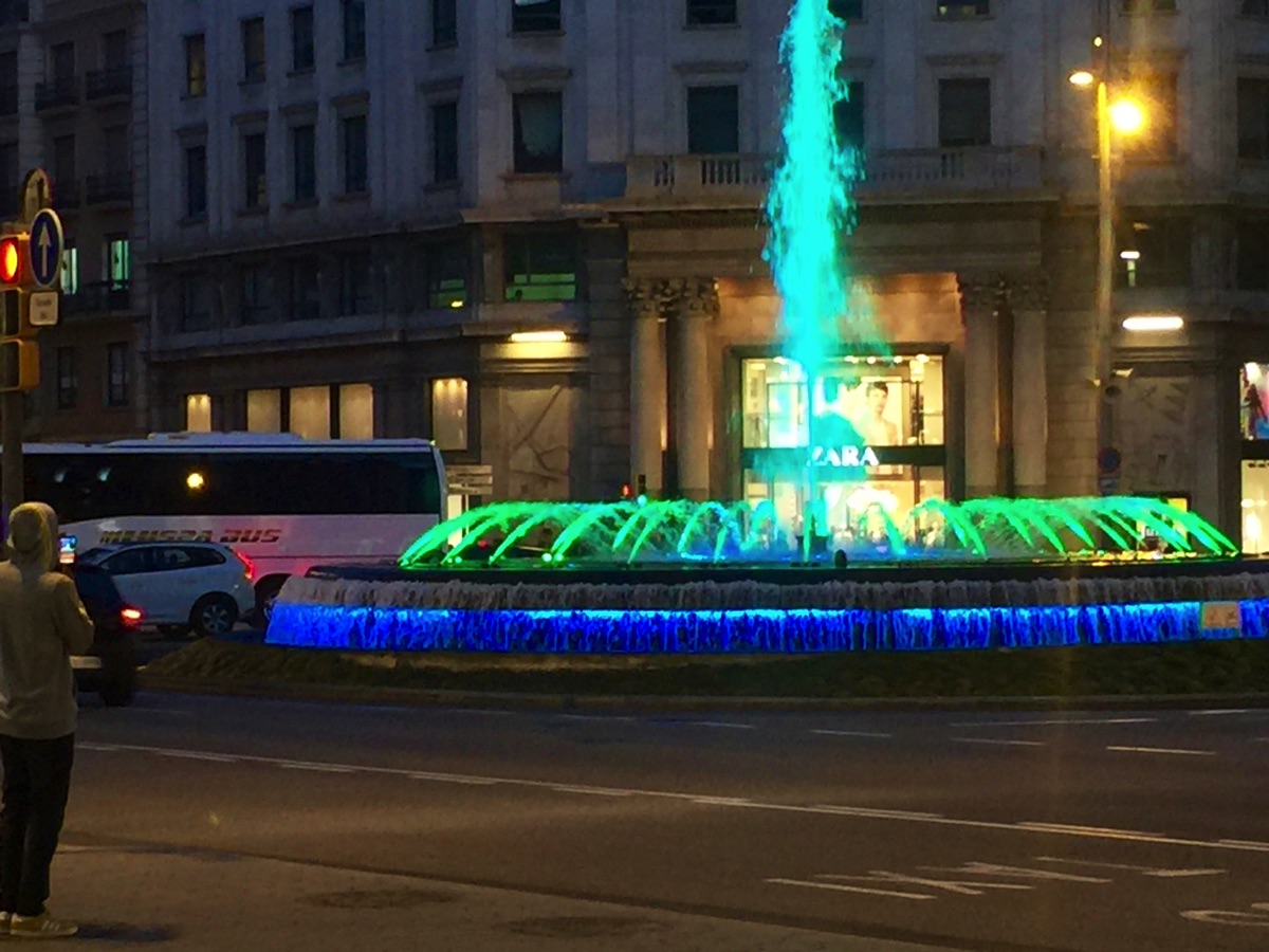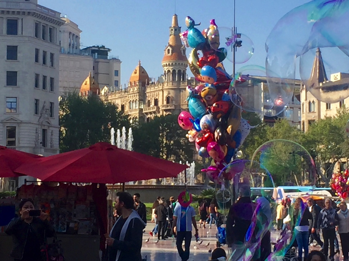 After we checked into the hotel, our tour leader, Africa, took us on a brief walking tour of Barcelona. The city was very crowded. Here in the Plaça de Catalunya, we encountered lots of balloons and giant bubbles.