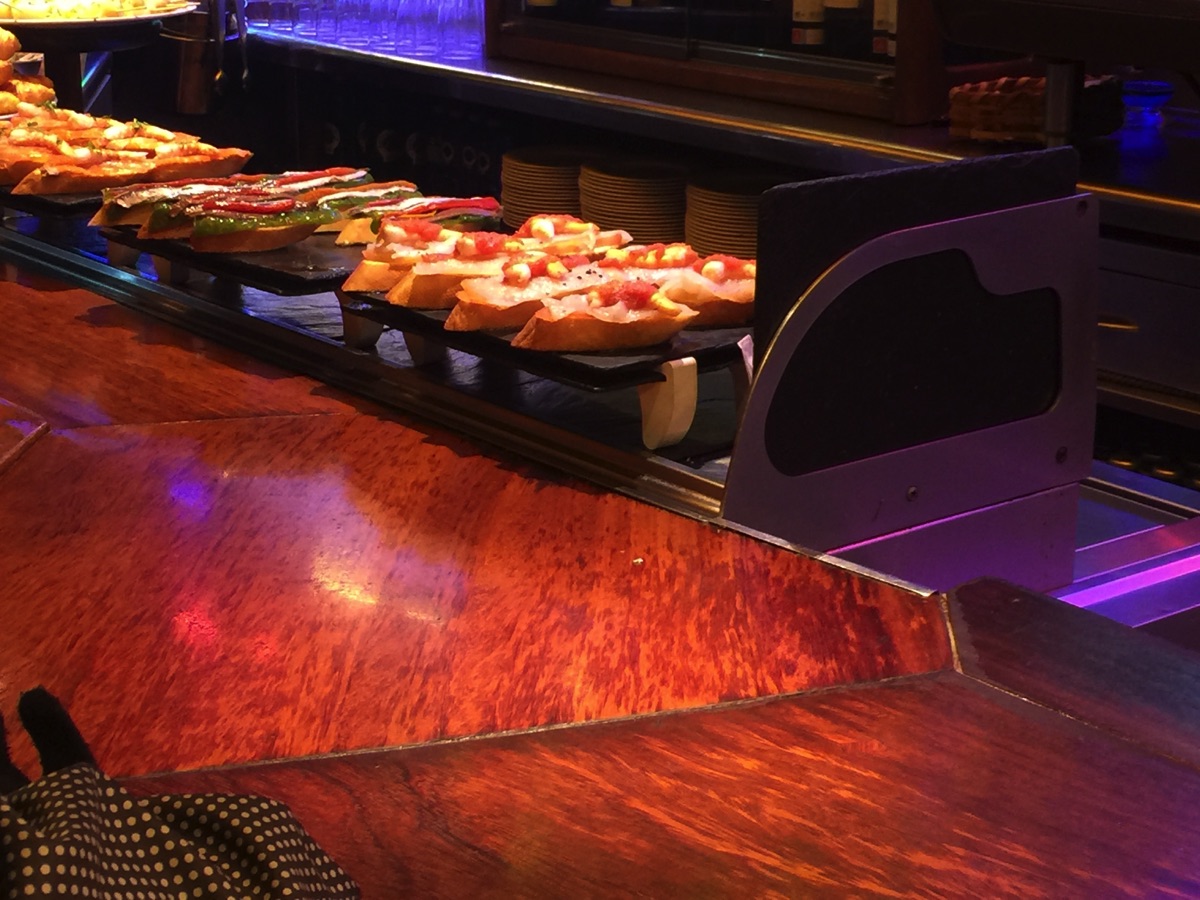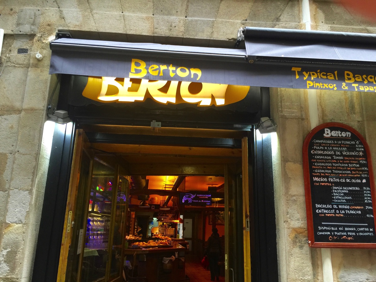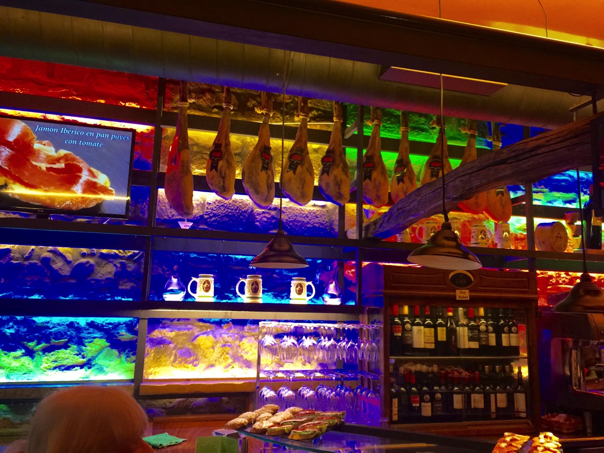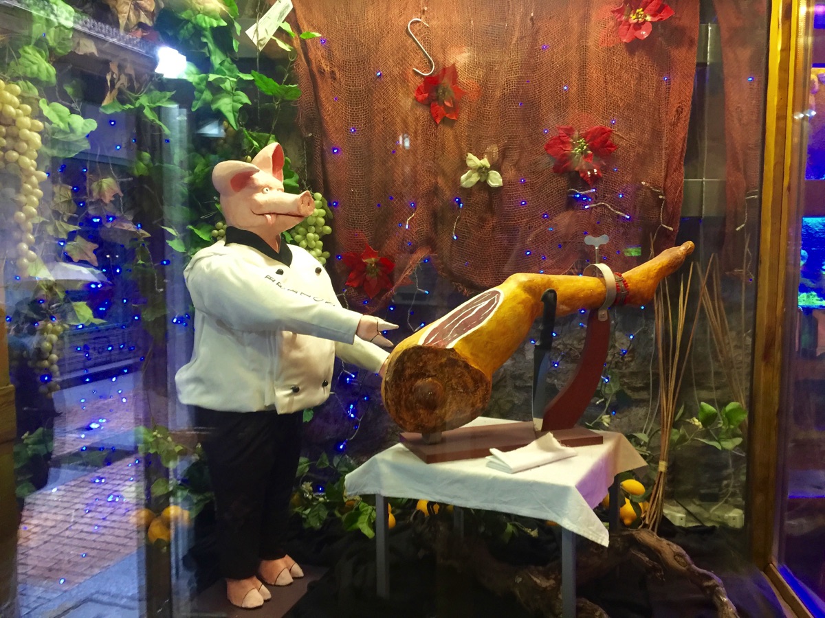 The old part of Bilbao has some tempting restaurants—many specialize in Iberico Ham, a specialty of Spain obtained from pure, black pigs.
