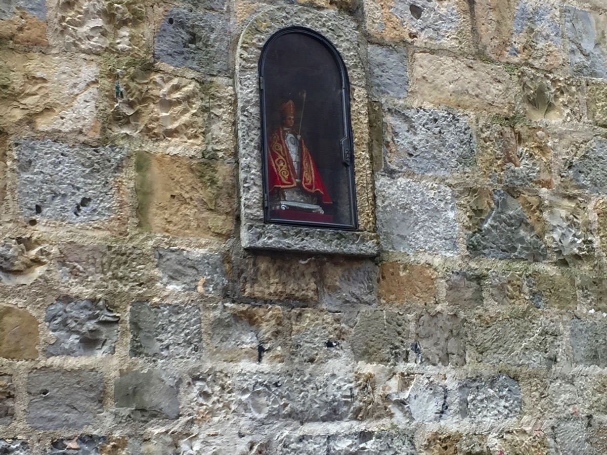 Statue of St. Fermin, a 3rd century martyr for Christianity. The running of the bulls takes place during the Festival of St. Fermin; prayers are said by runners at this statue before the race begins.