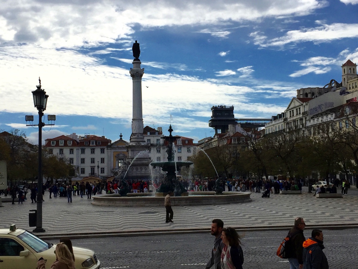 Rossio Square with monument to King Pedro IV in the center, dating from 1874. Pedro IV was also the first Emperor of Brazil. The Santa Justa lift is in the background vertically connecting lower Lisbon to an upper level of the city.