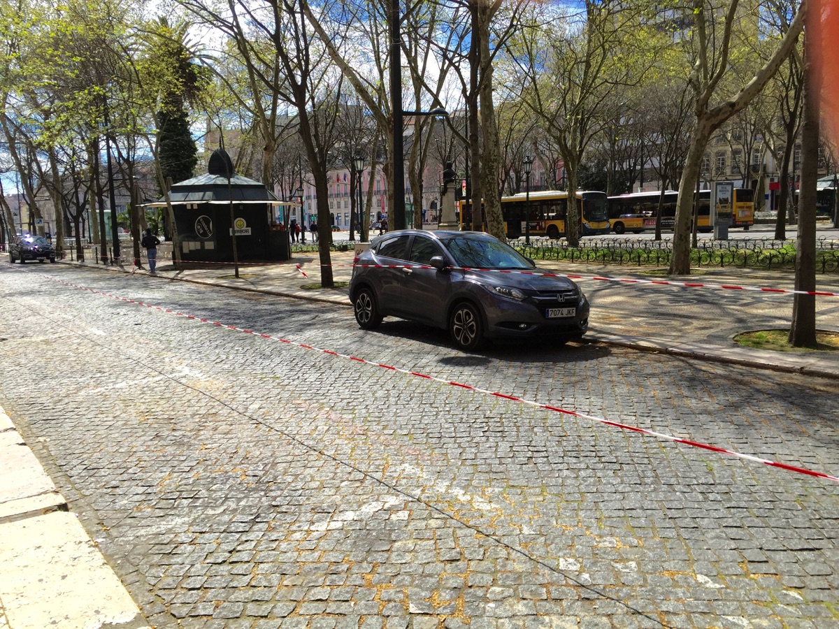 Not sure why cars were blocked off like this but a large number of streets had cars and parking spaces blocked off on this day which was a religious holiday for many (Good Friday).
