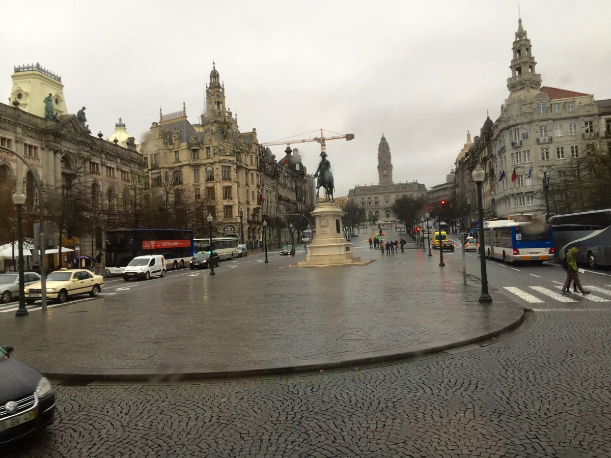 The Porto City Hall is in the distance with a statue of Peter IV in the foreground in Freedom Square.