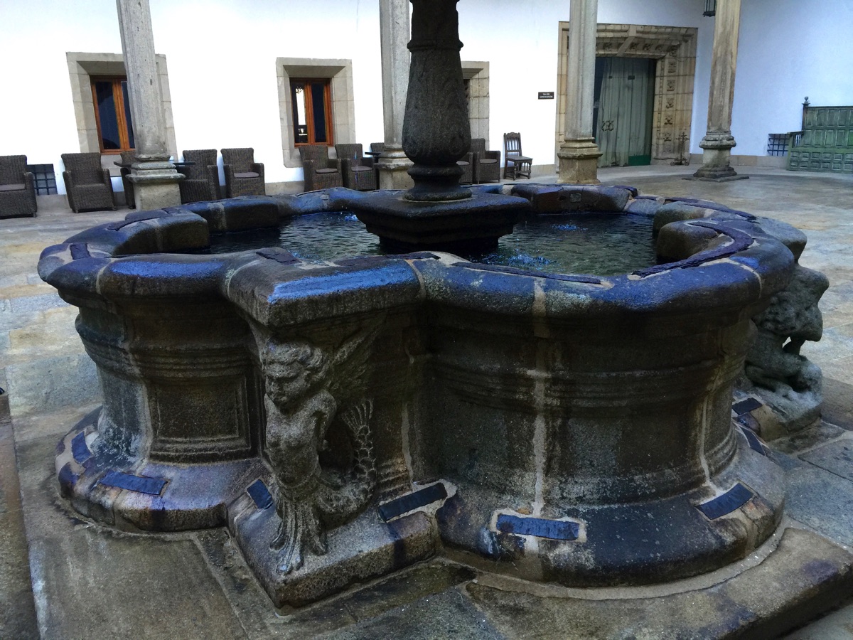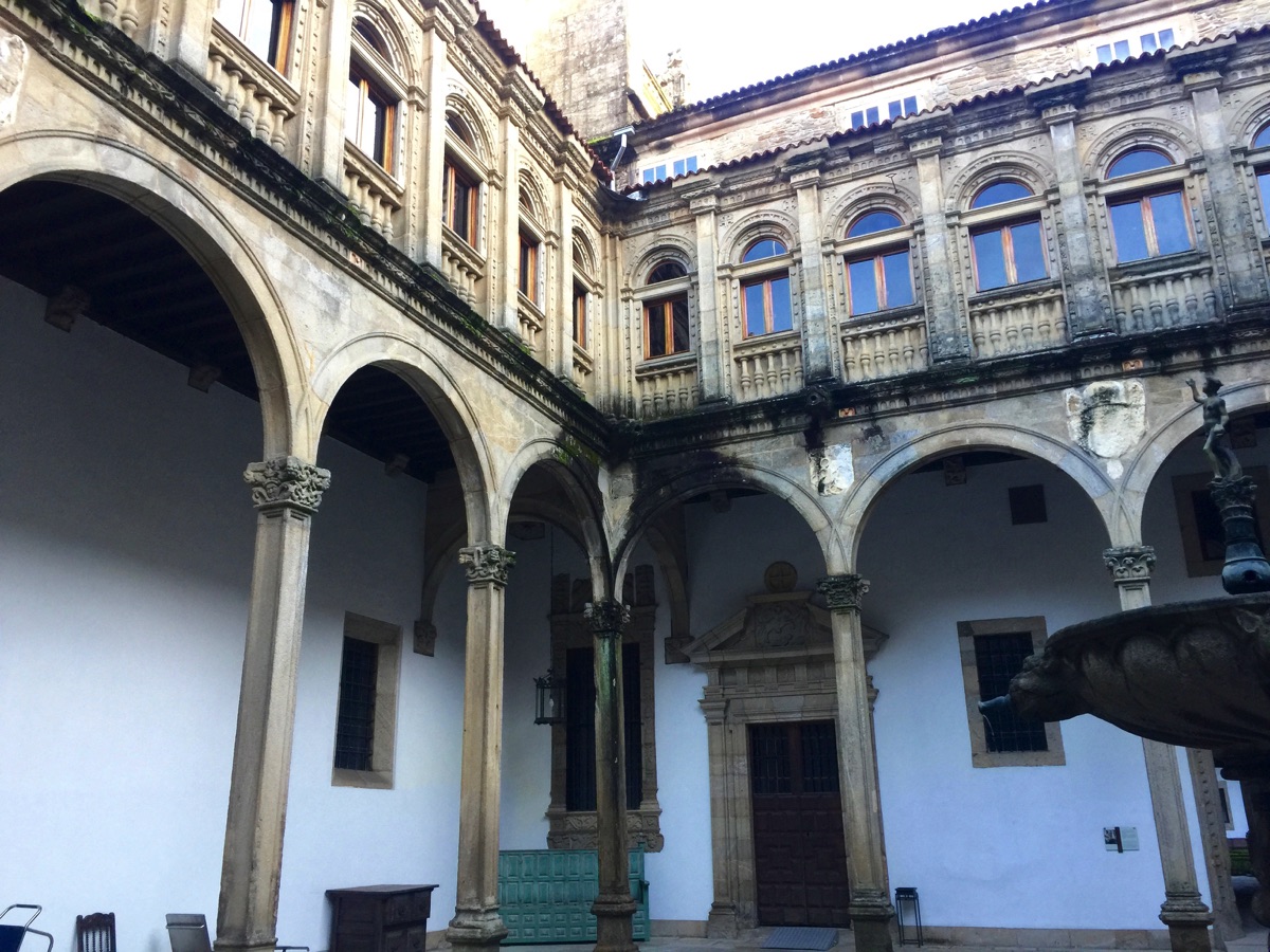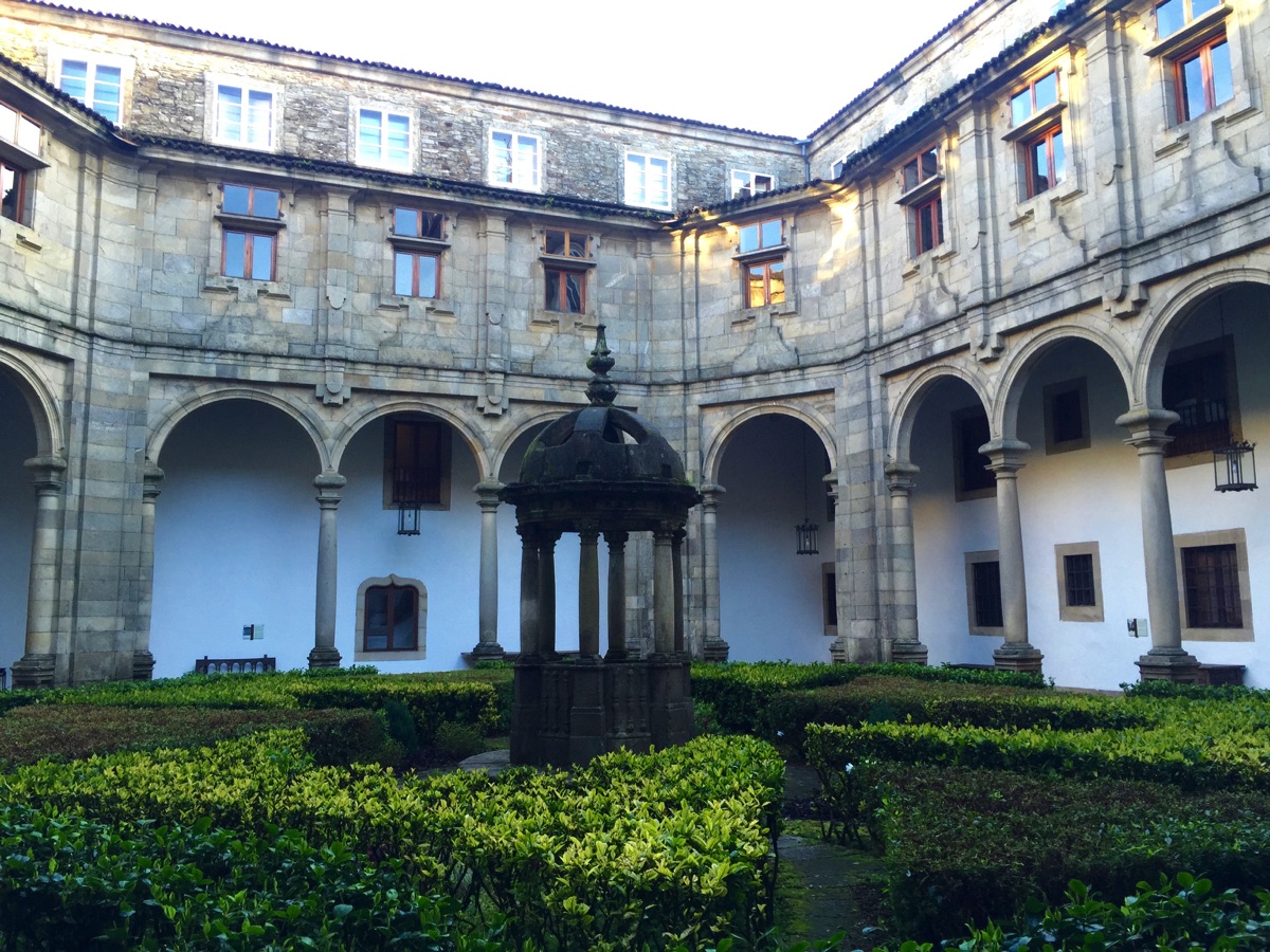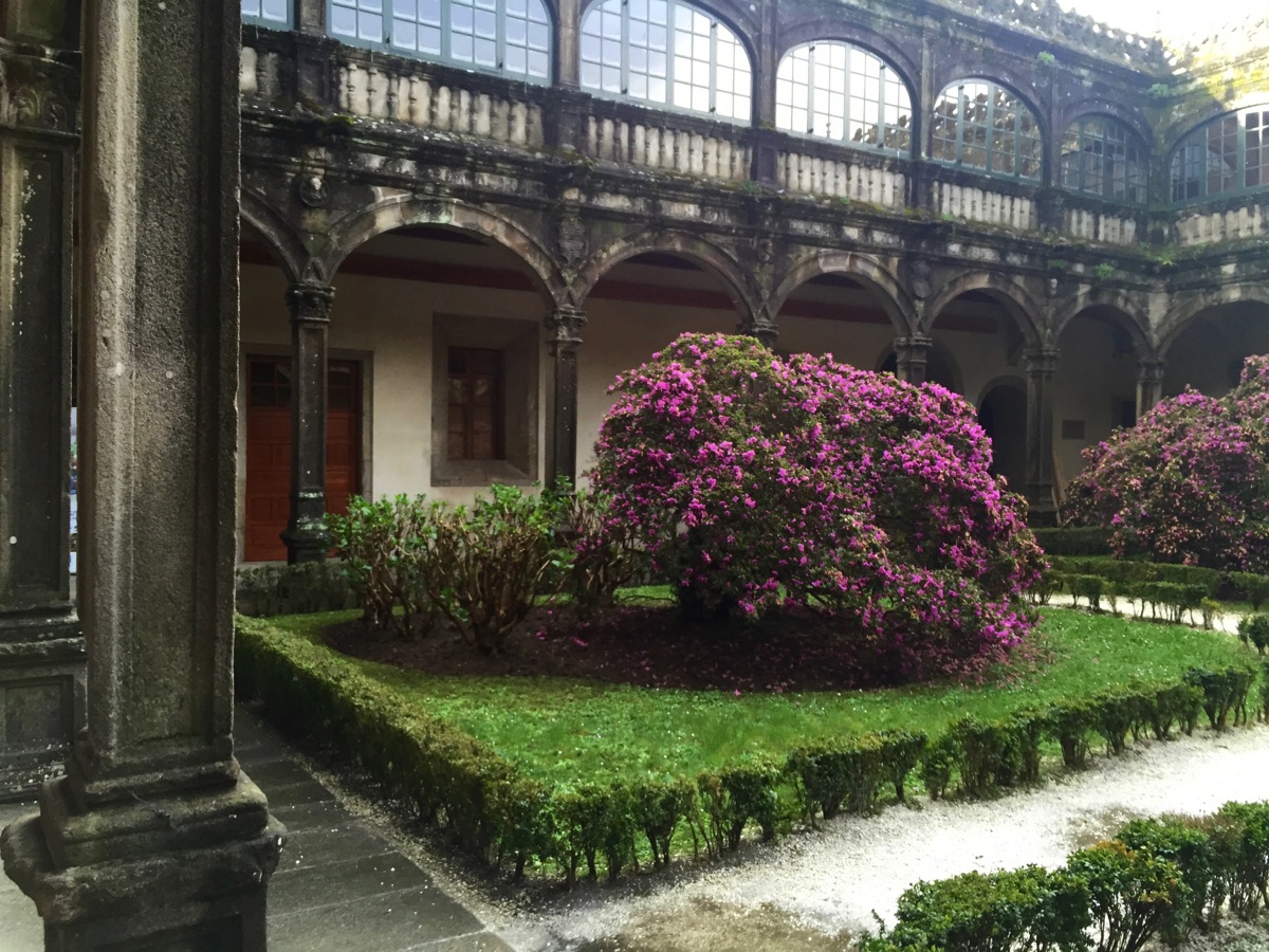 The Cathedral and the hotel for many pilgrims marks the end of the Camino (Way of St. James). Pilgrims have come from all directions, completing their pilgrimage here. The hotel's courtyard garden is shown here.