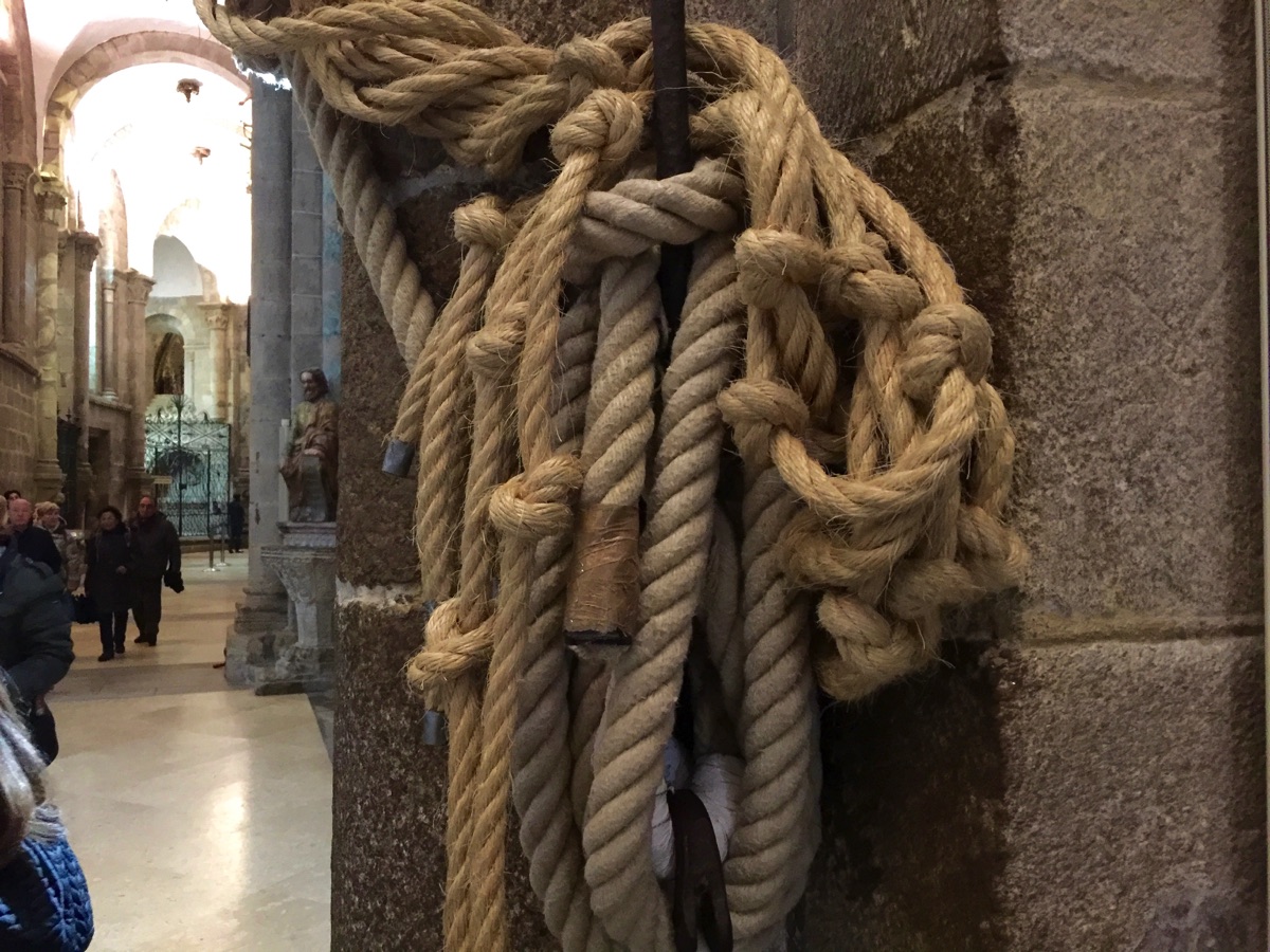 The ropes that are used to swing the huge Botafumeiro holding burning incense. It takes six to eight men to swing the 180 pound container during Masses. See the video for a demonstration.