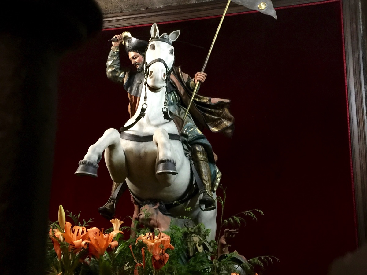 Statue of St. James, the Moor Slayer. Below the horse, the pictured St. James is cutting off the heads of Moors. The statue was judged offensive to Muslims and was scheduled to be removed but an outcry resulted in its retention. Perhaps the flowers hide the offending deed.
